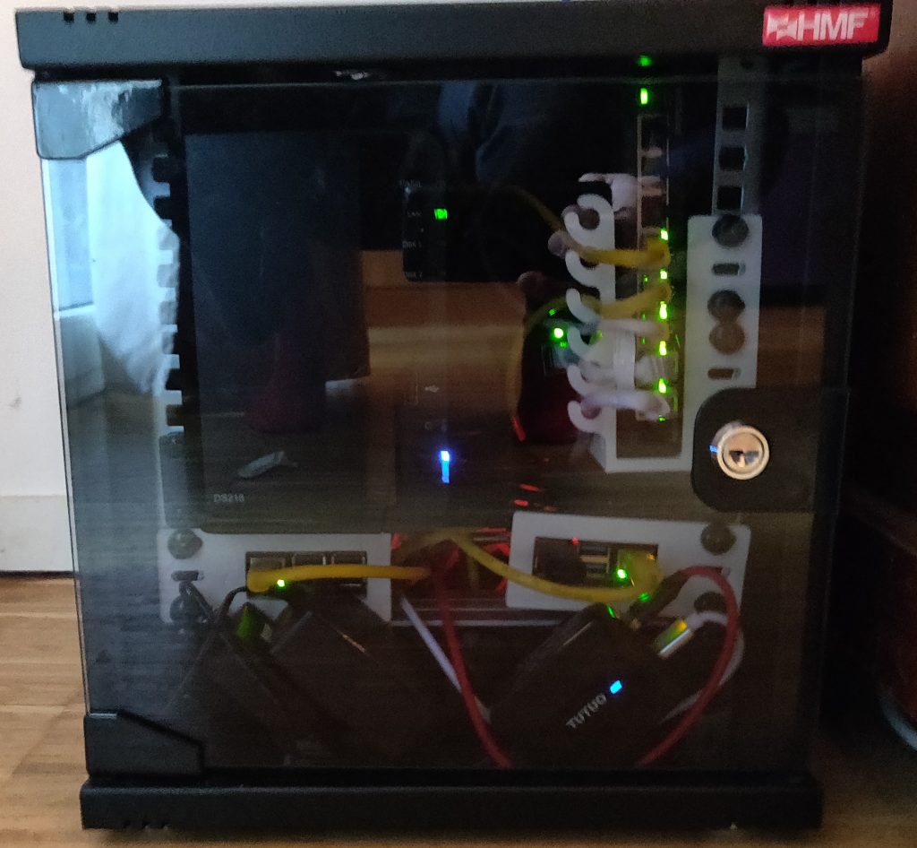 The server cabinet is hidden behind a shelf in our living room. I placed the power strip on the bottom. I printed all mounts and installed both Raspberry Pis under the shelf where they have enough space for heat distribution. The right one runs Home Assistant with the Zigbee Stick plugged into one of the front USB plugs. The switch has its own 3D printed mount including guidance for all attached ethernet cables.
