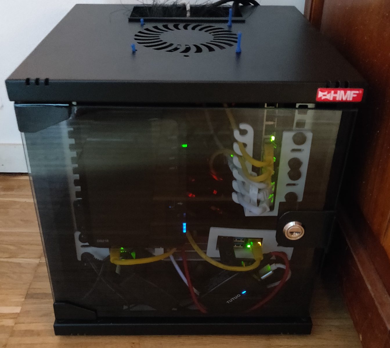 In general, all cables are in the back of the cabinet since there is the most space and I didn’t have cables in the correct length to mount them nicely in the front. So the back of the cabinet holds all the extra cable. For airflow, I mounted a fan on top of the cabinet to blow hot air out. It gets power from one of the Raspberry Pis pins. I have the NAS running in quiet mode and so far I didn’t have any heat issues.