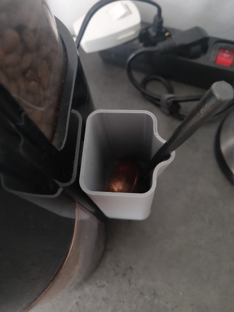We bought a new coffee spoon and needed a place for it. I figured the best place would be next to the coffee grinder where its needed most of the time. I designed the mount to fit the spoon and glued it to the coffee grinder. Printed in grey PETG.