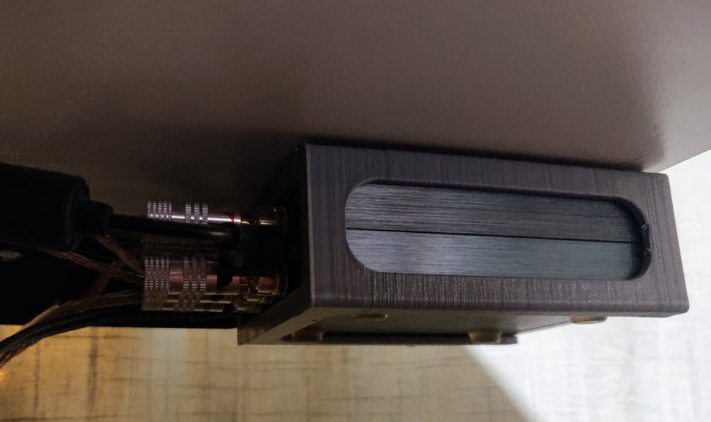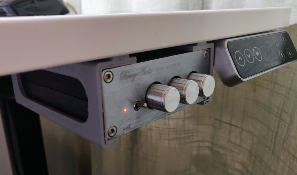 For my desktop speakers I use a small 2.1 amplifier. To place under the desnk I designed a mount for it. Now it’s underneath the desk and still easily accessible for me. Printed in grey PLA.