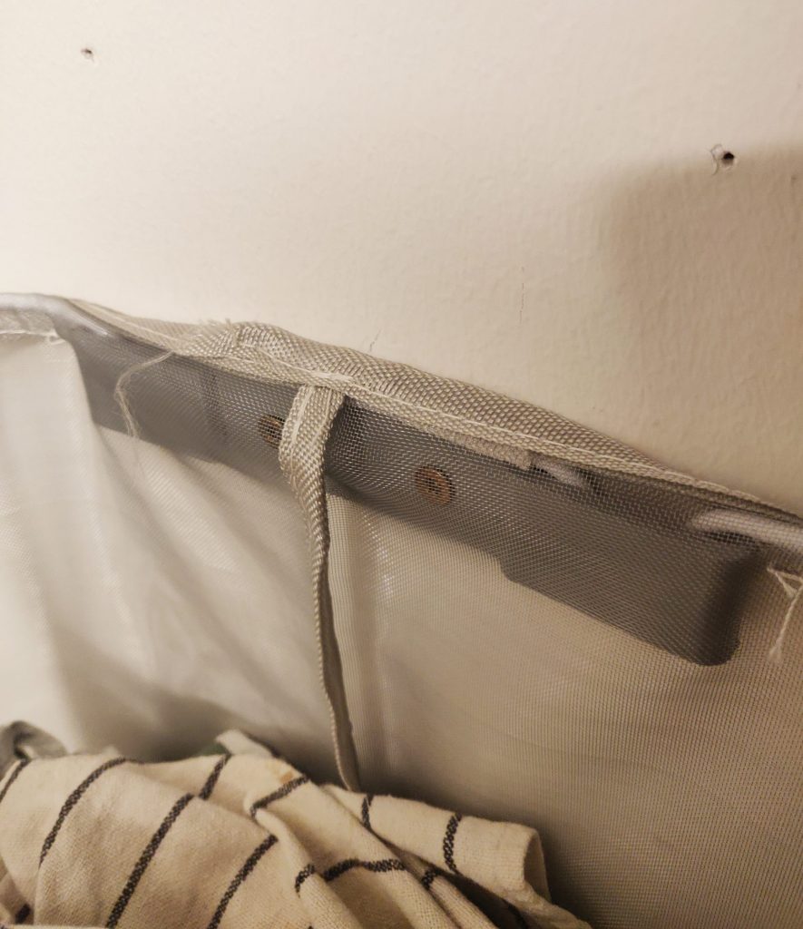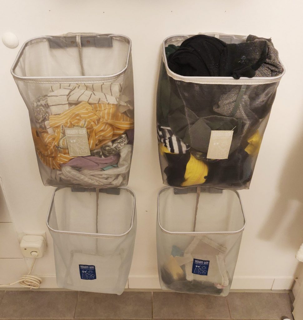 We were looking for a solution for our laundry to pre sort it before washing. So we founds small silver baskets to hang on the wall. They came with a mount to be glued to the wall which obviously didn’t hold the heavy clothes. So I designed a custom mount to be screwed into the wall.